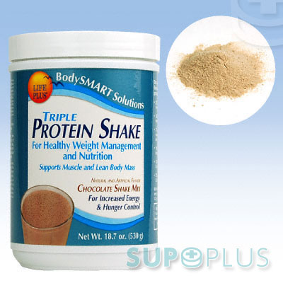 トリプルプロテインシェイクは、遺伝子操作されていない大豆、ミルクプロテインアイソレイト、ミルクからのカルシウムカゼインから配合されたプロテインが主成分です。1日3食のうち1食を置きかえてお召し上がりください。おいしいチョコレート味です。